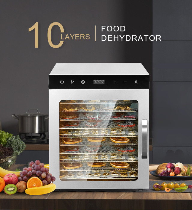 Оснащений 10-ма місткими лотками, ви матимете достатньо місця для сушіння великої кількості їжі за один раз. Якщо ви готуєте закуски для вечірки, зберігаєте сезонні продукти чи готуєте власне домашнє в’ялене м’ясо, цей дегідратор допоможе вам зробити це легко.