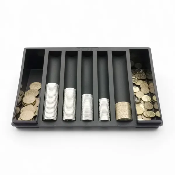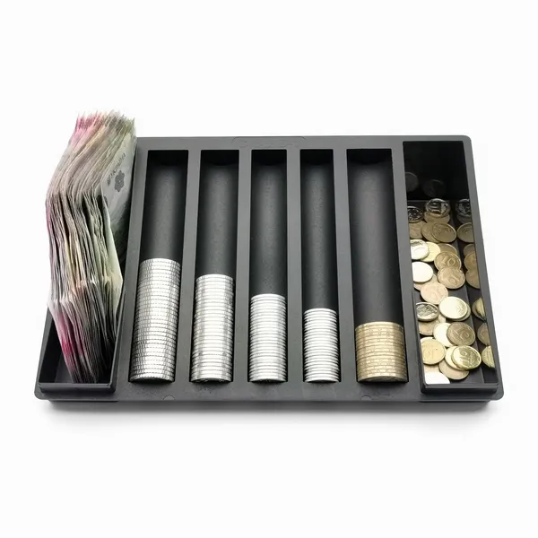Також цей варіант монетниці використовують продавці у сфері торгівлі, касири в банках та інших місцях. Бічні секції можна використовувати для купюр або для копійок насипом. Накривши кришкою, монетницю зручно перенести в інше місце або поставити в сейф.