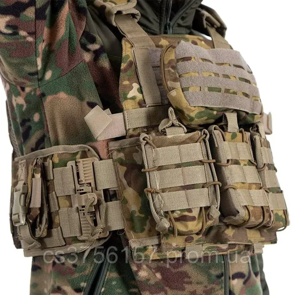 Плитоноска ТМ Asdag. Пошита из крепкой износостойкой кордуры. На лицевой стороне подсумки для магазинов (4 шт) и маленькие подсумки под гранаты (2 шт), а также подсумок-аптечка. Все подсумки съёмные на системе крепления Моле.