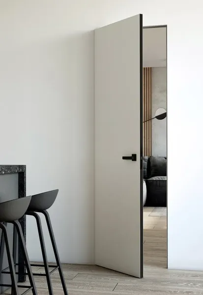 Двері прихованого монтажу HYGGE ALUM (чорний алюмінієвий торець полотна) (грунтівка: Білий), 672х2036