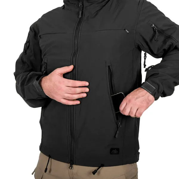 Helikon-Tex COUGAR® QSA™ + HID™ Jacket — Soft Shell Windblocker — легка демісезонна куртка з мембранної тканини, спеціально розроблена для представників поліцейських, силових і охоронних структур, які працюють в міських умовах. Завдяки унікальним властивостям високотехнологічних матеріалів, куртка відмінно утримує тепло, забезпечує надійний захист від сильного вітру і незначного дощу. У разі фізичних навантажень, відводить назовні зайве тепло і вологу, створюючи комфортну температуру тіла. Прихований в комірі капюшон, легко витягується назовні та регулюється за допомогою шоккорда з фіксаторами, виведеного в кишені. Куртка оснащена системою швидкого доступу Quick Side Access™ (QSA™), яка дає можливість миттєво дістати зброю або будь-який інший предмет, закріплений на поясі, одним плавним рухом, що значно впливає на швидкість реакції в надзвичайних, життєво-небезпечних ситуаціях. Система Hidden ID panels™ (HID™) складається з трьох кишень на грудях і спині, спеціально налаштованих під ідентифікаційні панелі різного розміру, які в залежності від обставин, носяться назовні або залишатися прихованими в кишенях. Куртка укомплектована двома порожніми панелями, які користувач може налаштувати методом вишивки або друку необхідної інформації.