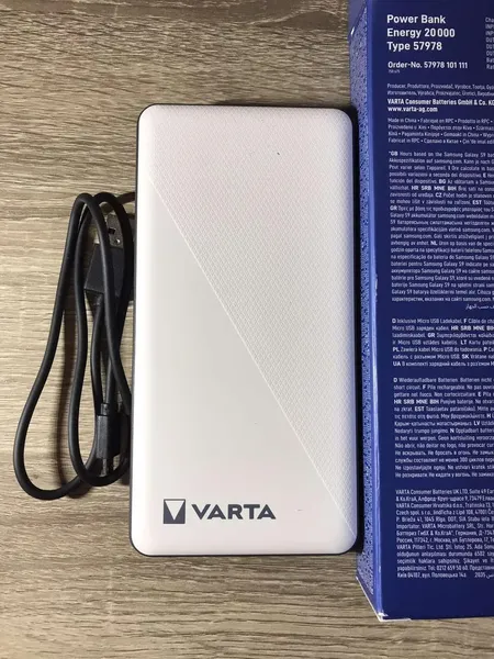 Якісний Powerbank з реальною ємністю 20000 mAh, що дозволяє заряджати павербанк і ваш пристрій одночасно!Особливості продукту:Виробник: VARTA BATTERIEЄмність акумулятора: 15000 mAhТип акумулятора: Li-PolymerВхідні розєми: Micro USB, USBКількість USB виходів: 3Вихідні розєми: USB x 2, USB Type-CКонфігурації вихідного струму: USB typu C: 5 V/3 AАксесуари: Micro USB кабель для зарядкиДвостороннє заряджання: дозволяє заряджати павербанк і ваш одночаснопристрійСтильний і фактурний пластиковий корпусОсобливості: заряджає 3 пристрої одночасно4 білі світлодіоди вказують на хід зарядки та стан розрядкиОснащений передовою технологією безпеки VARTAГарантія якості бренду VARTAЄмність: 20 000 мАг / 3,7 В