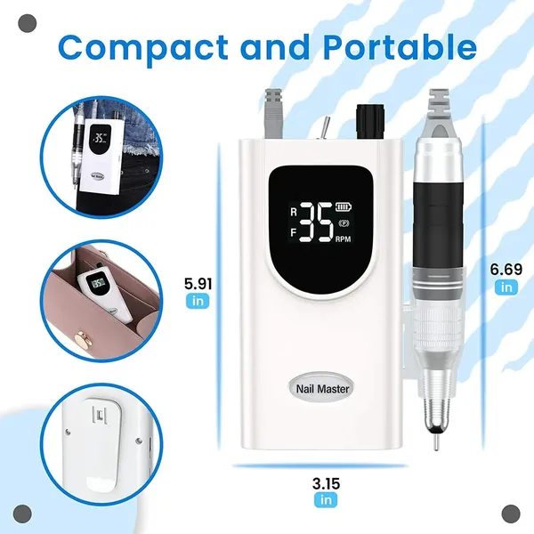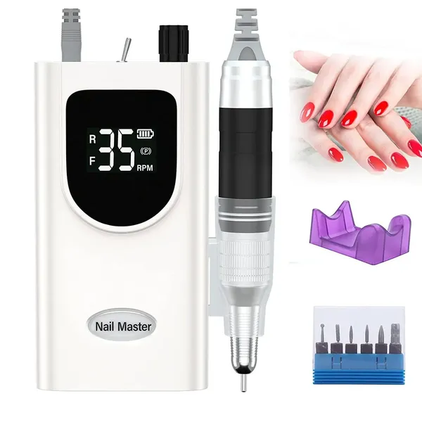 Delanie Nail Drill 35000RPM, перезаряжаемая портативная акриловая пилочка для ногтей Efile Профессиональная дрель для ногтей с 6 битами и шлифовальными лентами Электрическая пилочка для ногтей (белая)